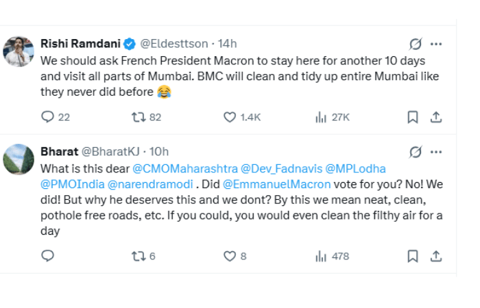 हिंदुस्थानच्या दौऱ्यावर असलेले फ्रान्सचे अध्यक्ष इमॅन्युएल मॅक्रॉन यांच्यसाठी मंगळवारी महापालिकेने दक्षिण मुंबईतील रस्त्यांची डागडुजी करायला सुरुवात केली आहे.