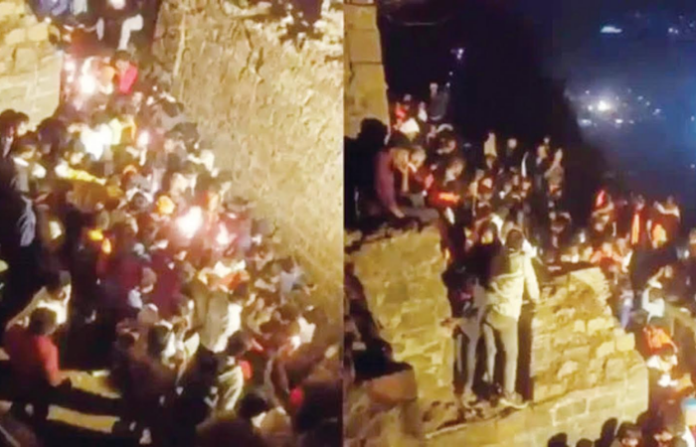 शिवभक्तांचा एक जथा शिवज्योत घेऊन गडावर दाखल झाला. ज्योत घेऊन काही युवक वेगाने पुढे सरकत होते. यावेळी मीना दरवाजाजवळ बंदोबस्तासाठी तैनात पोलिसांनी त्यांना हळू जाण्याचे आवाहन केले. यावेळी गर्दीमुळे तिघेजण घसरून खाली पडले. या घटनेत त्यांना किरकोळ दुखापत झाली, अशी माहिती याबाबत पोलीस अधीक्षक संदीप सिंग यांनी दिली. गडावर पुरेसा बंदोबस्त तैनात होता. या घटनेनंतर अतिरिक्त खबरदारी घेऊन टप्प्याटप्प्याने शिवभक्तांना गडावर प्रवेश दिला गेला. गडावरून उतरताना सर्वांनी शिस्त पाळावी, प्रशासनाला सहकार्य करावे, असे आवाहन करण्यात आल्याचेही संदीप सिंग यांनी सांगितले.