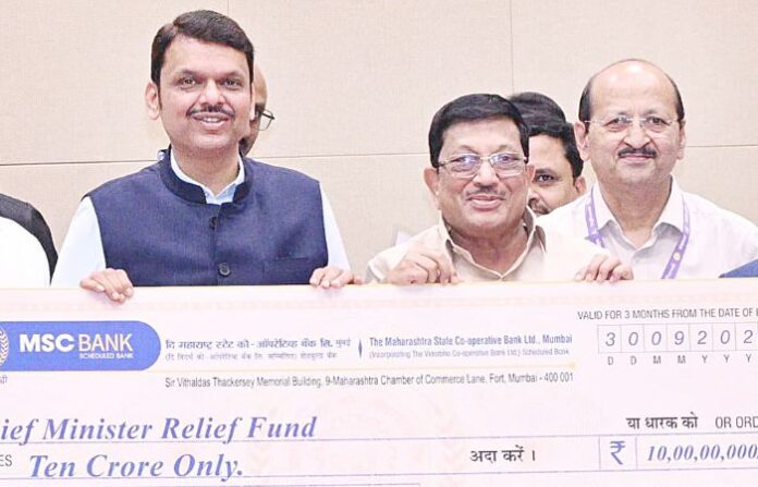 मराठवाडा, उत्तर महाराष्ट्रासह राज्यातील अनेक भागांत झालेल्या अतिवृष्टीमुळे आर्थिक संकटात सापडलेल्या शेतकऱ्यांना राज्य सहकारी बँकेकडून 10 कोटी रुपयांचे अर्थसहाय्य करण्यात आले आहे. बँकेचे प्रशासक विद्याधर अनास्कर यांनी आज मदतनिधीचा धनादेश मुख्यमंत्री देवेंद्र फडणवीस यांच्याकडे सुपूर्द केला.