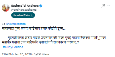 सुषमा अंधारे यांच्या दाव्यानुसार, साताऱ्यात इतक्या मोठ्या प्रमाणावर अंमली पदार्थांचे जाळे पसरले आहे. मात्र, प्रशासन यावर ठोस कारवाई करण्याऐवजी राजकीय समीकरणांमध्ये गुंतले आहे का, असा संशय त्यांनी व्यक्त केला आहे. आगामी मुंबई महानगरपालिका निवडणुकांच्या तोंडावर हे केवळ राजकीय दबावतंत्र असल्याचा आरोपही त्यांनी आपल्या पोस्टमधून केला आहे.