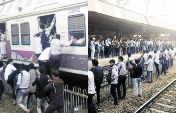 दिवा रेल्वे स्थानकात प्रचंड गर्दी असल्यामुळे काही प्रवासी लोकल पकडण्यासाठी रेल्वे लाइनमध्ये उतरून उलट्या दिशेने डब्यात चढत आहेत. लोकल प्रवासासाठी प्रवाशांकडून होत असलेल्या या जीवघेण्या कसरतीचा व्हिडीओ सोशल मीडियावर व्हायरल झाल्यामुळे एकच खळबळ उडाली आहे. pic.twitter.com/HWzZBHoHF0