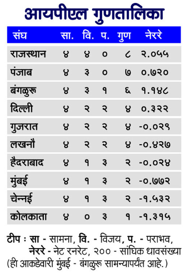 दुसरीकडे, आरसीबीने चार सामन्यांपैकी तीन विजय मिळवून पॉइंट्स टेबलमध्ये आपले तिसरे स्थान कायम राखले आहे.