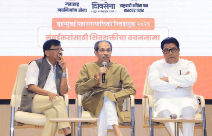 शिवसेना भवन येथे आज शिवसेना (उद्धव बाळासाहेब ठाकरे), मनसे आणि राष्ट्रवादी काँग्रेस (शरदचंद्र पवार) यांच्या महायुतीचा संयुक्त वचननामा जाहीर करण्यात आला. यावेळी पक्षप्रमुख उद्धव ठाकरे आणि मनसेप्रमुख राज ठाकरे यांनी संयुक्त पत्रकार परिषद घेतली. या वेळी बोलताना उद्धव ठाकरे म्हणाले की, राज ठाकरे 20 वर्षांनंतर शिवसेना भवनमध्ये आले आहेत, दोन भाऊ पुन्हा एकत्र आले आहेत आणि त्यामुळे संपूर्ण महाराष्ट्रात नवचैतन्याची लहर निर्माण झाली आहे. शिवशक्तीचा वचननामा जनतेसमोर सादर करत आहोत, अशी घोषणाही त्यांनी केली. त्यांनी पुढे म्हटले की ही सत्ता झुंडशाही आहे, याला लोकशाही म्हणता येणार नाही. आम्ही त्यांच्या मतचोरीचा पर्दाफाश केला असून आता उमेदवारांची पळवापळवी सुरू केली आहे. एवढे निगरगट्ट आणि कोडगे राज्यकर्ते महाराष्ट्राला यापूर्वी लाभले नव्हते, असा आरोप त्यांनी केला.
