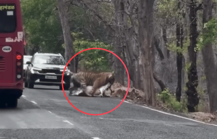 वाघाने आपली शिकार रस्त्याच्या अगदी कडेलाच नेऊन ठेवली. नियमानुसार शिकार केल्यानंतर वाघ तिचे रक्षण करण्यासाठी आणि ती खाण्यासाठी पुढचे काही दिवस त्याच परिसरात वास्तव्यास असतो. त्यामुळे या महामार्गावर प्रवाशांच्या सुरक्षेचा प्रश्न निर्माण झाला आहे. खबरदारीचा उपाय म्हणून वनविभागाने या परिसरात गस्त वाढवली असून प्रवाशांना या भागात वाहने न थांबवण्याचे आवाहन करण्यात आले आहे.