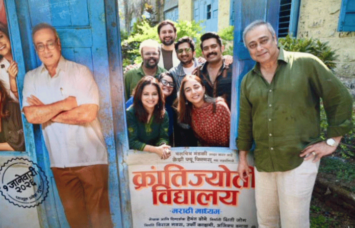 मराठी शाळांच्या अस्तित्वावर मनोरंजक पद्धतीने भाष्य करणाऱ्या बहुप्रतिक्षित ‘क्रांतिज्योती विद्यालय- मराठी माध्यम’ या सिनेमाचा ट्रेलर नुकताच अनोख्या पद्धतीने प्रदर्शित झाला. अलिबाग मधील नागाव येथील ज्या शाळेत सिनेमाचे चित्रीकरण झाले त्याच शाळेच्या चौकात ट्रेलर अनावरणाचा सोहळा पार पडला. वर्गखोल्या, बाक, फळा आणि मैदान साक्षीदार असलेल्या या ठिकाणी कलाकार आणि उपस्थितांनी पुन्हा एकदा आपल्या शालेय आणि चित्रीकरणाच्या आठवणींना उजाळा दिला.