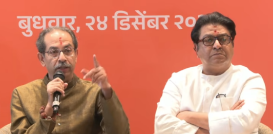 हिंदुहृदयसम्राट शिवसेनाप्रमुखांचे दोन वाघ शिवसेना (उद्धव बाळासाहेब ठाकरे) पक्षप्रमुख उद्धव ठाकरे आणि मनसे अध्यक्ष राज ठाकरे हे एकत्र येणार हे निश्चित झालेच होते, फक्त आता अधिकृत घोषणा बाकी होती. घोषणा ऐकण्यासाठी मराठीजनांने कान आसुसलेले होते. अखेर ती वेळ आलीच. 24 डिसेंबर रोजी दुपारी 12 वाजता मनसे अध्यक्ष राज ठाकरे यांनी दोन्ही पक्ष एकत्र निवडणूक लढणार … Continue reading मुंबईला महाराष्ट्र आणि मराठी माणसापासून तोडण्याचा प्रयत्न करणाऱ्याचा राजकारणात खात्मा केल्या शिवाय राहणार नाही, शपथ घेऊन एकत्र आलो आहोत! – उद्धव ठाकरे