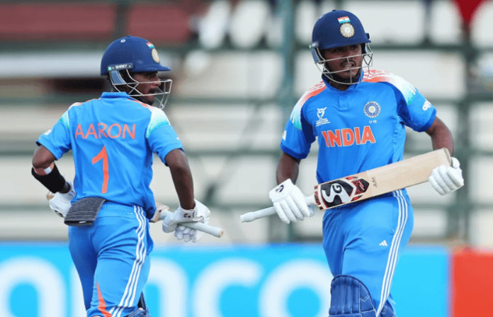 हरारे स्पोर्ट्स क्लबमध्ये टीम इंडिया आणि अफगाणिस्तान यांच्यामध्ये सेमी फायनलचा सामना पार पडला. अफगाणिस्तानने नाणेफेक जिंकून प्रथम फलंदाजी करण्याचा निर्णय घेतला. अफगाणिस्तानच्या फैसज शिनोजादा (110) आणि उझैरल्लाह नियाझाई (101*) यांनी दमदार फलंदाजी केली. त्यामुळे अफगाणिस्तानने चार गड्यांच्या मोबदल्यात 310 धावा केल्या आणि 311 धावांचे आव्हान टीम इंडियाला दिले. आव्हानाचा पाठलाग करताना टीम इंडियाची सलामीची जोडी अफगाणिस्तानच्या गोलंदाजांची चांगलीच शाळा घेतली. अॅरोज जॉर्जने 104 चेंडूंमध्ये 15 चौकार आणि 2 षटकार मारत 115 धावांची सलामी दिली. तर वैभव सूर्यवंशीने 33 चेंडूंमध्ये 9 चौकार आणि 4 षटकारांच्या जोरावर 68 धावांची वादळी खेळी केली. तर कर्णधार आयुष म्हात्रेनेही आपले हात धुवून घेत 62 धावांची झंझावती खेळी केली. त्यानेही 5 चौकार आणि 4 षटकार ठोकले. विहान मल्होत्राने नाबाद 38 धावांची विजयी खेळी केली आणि टीम इंडियाने 3 गड्यांच्या मोबदल्यात 310 धावांचा डोंगर भेदून काढला.