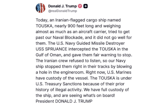दरम्यान, या घटनेनंतर इराणनेही होर्मुझच्या सामुद्रधुनीतून जाणारे बोट्सवाना आणि अंगोलाचे दोन तेलवाहू टँकर अडवून त्यांना परत माघारी फिरण्यास भाग पाडले. दुसरीकडे अमेरिकन नौदलाने केलेल्या करावाईचे अमेरिकेचे राष्ट्रीय अध्यक्ष डोनाल्ड ट्रम्प यांनी समर्थन केले आहे. ‘900 फूट लांब आणि विमानवाहू युद्धनौकेएवढे वजन असलेल्या इराणच्या तुस्का या जहाजाने नाकेबंदी मोडण्याचा प्रयत्न केला. अमेरिकन युद्धनौका यूएसएस स्प्रुआन्सने हे जहाज अडवले आणि थांबण्याची स्पष्ट ताकीद दिली. जहाजावरील कर्मचाऱ्यांनी त्याकडे दुर्लक्ष केल्याने अमेरिकन नौदलाने गोळीबार करत इंजिन रुमला छिद्र पाडले आणि जहाज रोखले. सध्या या जहाजाचा ताबा मरीन कॉर्प्सकडे असून जहाज पूर्णपणे आमच्या ताब्यात आणि जहाजावरील मालाची तपासणी सुरू आहे’, असे ट्रम्प यांनी ट्रूथ सोशलवर पोस्ट करून सांगितले.