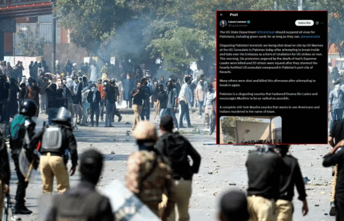 इराणचे सर्वोच्च नेते अयातुल्ला अली खामेनी यांच्या मृत्यूनंतर पाकिस्तानमध्ये संतापाची लाट उसळली. कराचीतील अमेरिकन वाणिज्य दूतावासावर आंदोलकांनी हिंसक हल्ला करण्याचा प्रयत्न केला. या घटनेचे पडसाद आता अमेरिकेत उमटू लागले असून, पाकिस्तानमधील कट्टरतावादाचा दाखला देत अमेरिकेने पाकिस्तान्यांविरोधात कठोर पावले उचलण्याची मागणी केली आहे. अमेरिकेतील कार्यकर्त्या लॉरा लूमर यांनी थेट परराष्ट्र मंत्री मार्को रुबिओ यांना टॅग करत सर्व पाकिस्तान्यांचे व्हिसा आणि ‘ग्रीन कार्ड’ तात्काळ रद्द करण्याची मागणी सोशल मीडियावर केली आहे.