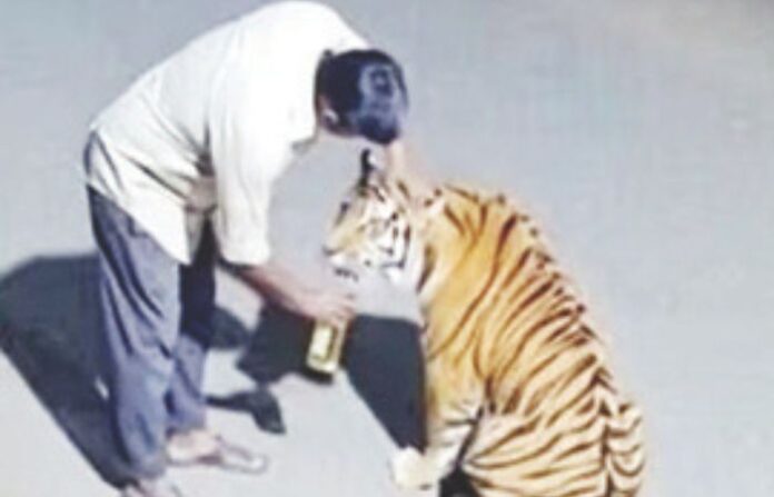 एका दारू प्यायलेल्या व्यक्तीचा व्हिडीओ सोशल मीडियावर प्रचंड व्हायरल झाला आहे. या मद्यपी व्यक्तीने मध्यरात्रीच्या सुमारास थेट वाघाला दारू पाजण्याचा प्रयत्न केल्याचे या व्हिडीओमध्ये दिसत आहे. ही व्यक्ती दारूच्या नशेत होती. त्याला वाटले की, ही मोठी मांजर आहे. त्यामुळे तो वाघाला गोंजारत असून दारू पाजण्याचा प्रयत्न करत होता. विशेष म्हणजे या व्हिडीओत वाघ या व्यक्तीच्या समोर शांत उभा आहे. हा मद्यपी वाघाला दारूची ऑफर करतो त्यावेळी वाघ आपली मान फिरवतो. दारू प्यायल्यानंतर मद्यपी व्यक्तीचे वाढलेले धाडस आणि वाघाची शांतता पाहून अनेकांना धक्का बसला आहे. हा व्हिडीओ अनेकांनी सोशल मीडियावरून शेअर केला आहे. ही घटना मध्य प्रदेशातील असून यावर अनेक नेटिजन्स वेगवेगळ्या कमेंट करत आहेत. देशीदारूपुढे सगळं काही फेल आहे. वाघ काहीच कसं करत नाही, असेही काहींनी आपल्या कमेंटमध्ये म्हटले आहे.