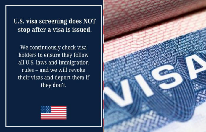 अमेरिकेच्या दूतावासाने ‘X’ या सोशल मीडिया प्लॅटफॉर्मवर एक निवेदन जारी केले. “व्हिसा जारी झाल्यानंतर अमेरिकन व्हिसाधारकांची तपासणी थांबत नाही. सर्व अमेरिकन कायदे आणि इमिग्रेशन नियमांचे पालन केले जात आहे की नाही, हे सुनिश्चित करण्यासाठी आम्ही व्हिसाधारकांची सातत्याने तपासणी करतो. जर कोणी या नियमांचे पालन केले नाही तर, आम्ही त्यांचे व्हिसा रद्द करून त्यांना त्यांच्या मायदेशात डिपोर्ट करू”, असे अमेरिकेने म्हटले आहे.